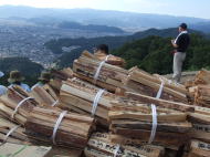 火床近くの高さまで運ばれ、積み上げられた割木や護摩木を、ボーイスカウト・ボランティアなどが流れ作業で中心の金尾近くまで運びます。