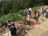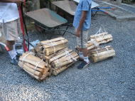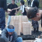 すべての木を山まで運び、均等に配分します。 配分された木を、まず大きさごとに分けていきます。大きい木を土台として使い、次に中・小と続き一番上には護摩木が組まれます。木を組むとき、木の皮を内側にすることで燃えやすくします。