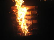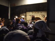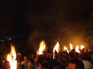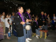 5j時30分に法音寺に再集合しました。 そこでは行列のときに燃やす松明作りをします。軽く夕食を取り、近所の方々が集まってきた7時頃に大きな松明に火をつけます。 そこから行列が出発し、山を登り、大きな松明以外の火を消します。