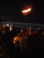 20:15〜 いよいよ船形万燈籠点火時間、多くの人が集っていました。 点火が始まると「おおー」という大きな歓声とともに妙見山に船形が現れます。船形は30分間ほど力強く燃え続けました。