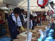 16日当日は朝9時から護摩木の受付が始まります。 志納の受付開始すぐは、数人だった志納者も開始30分ほどで、テントの中はいっぱいになってきました。御年配の方から小さな子供まで老若男女、皆さんそれぞれの思いを鳥居形の印が押された護摩木に込めています。