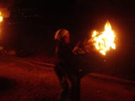 18:30 放水作業。回りに生えている木や草をしっかり濡らします。消防の皆さんはこの後も常に火の側に控えています。松明が点火されると火の粉や灰がたくさん飛びますが、すぐに消防隊員の方が消し止めます。