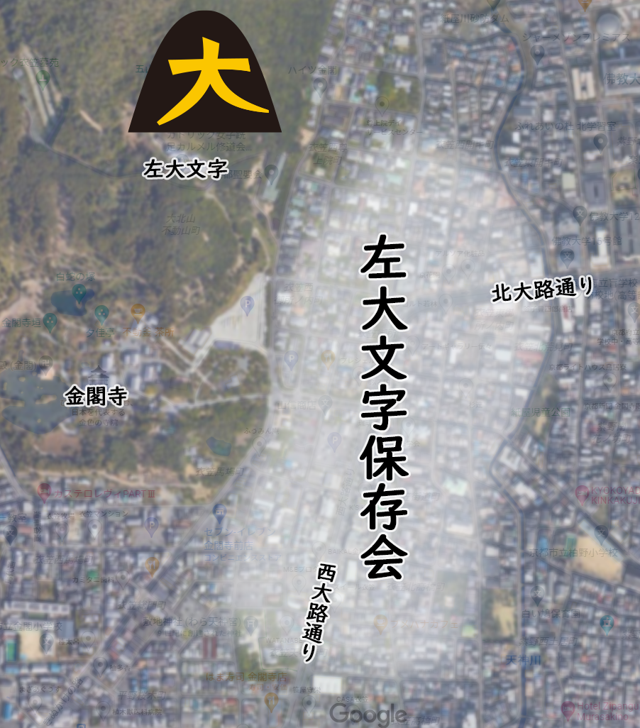 左大文字送火所在的大文字山位于京都市北区大北山的镜石町。旧大北山村包括鹿苑寺门前街,与鹿苑寺关系密切,因此上述“当山”可能指的就是大文字山。